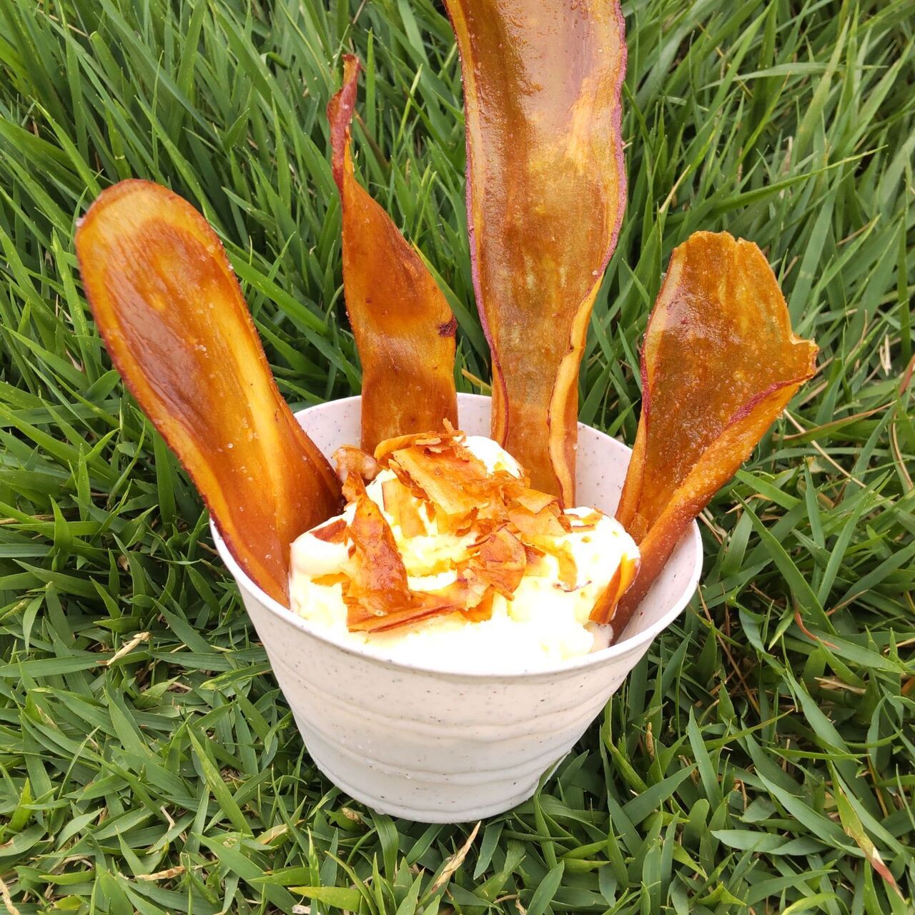 パリパリのさつまいもチップスをバニラアイスに挿しました。